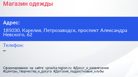 Магазин одежды по адресу 185030, Карелия, Петрозаводск, проспект Александра Невского, 62 в дальнейшем Организация, размещена в следующих категориях: