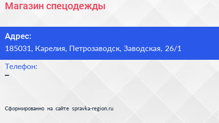 Магазин спецодежды по адресу 185031, Карелия, Петрозаводск, Заводская, 26/1 в дальнейшем Организация, размещена в следующих категориях: