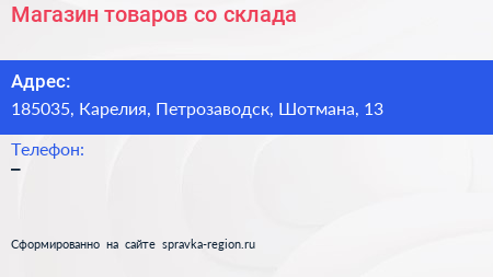 Магазин товаров со склада по адресу 185035, Карелия, Петрозаводск, Шотмана, 13 в дальнейшем Организация, размещена в следующих категориях: