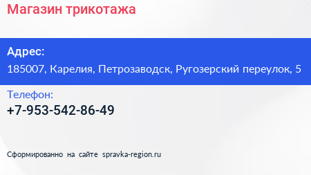 Магазин трикотажа по адресу 185007, Карелия, Петрозаводск, Ругозерский переулок, 5 в дальнейшем Организация, размещена в следующих категориях: