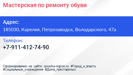 Мастерская по ремонту обуви по адресу 185030, Карелия, Петрозаводск, Володарского, 47а в дальнейшем Организация, размещена в следующих категориях:
