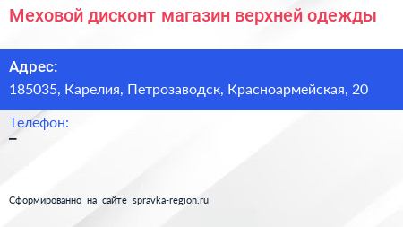 Меховой дисконт, магазин верхней одежды по адресу 185035, Карелия, Петрозаводск, Красноармейская, 20 в дальнейшем Организация, размещена в следующих категориях:
