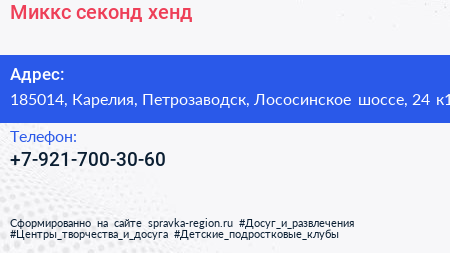 Миккс, секонд-хенд по адресу 185014, Карелия, Петрозаводск, Лососинское шоссе, 24 к1 в дальнейшем Организация, размещена в следующих категориях:
