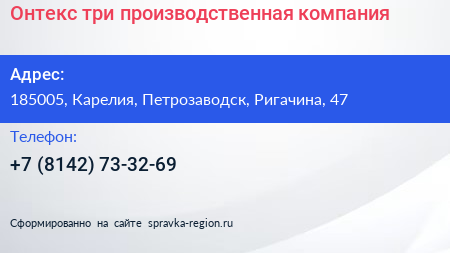 Онтекс-три, производственная компания по адресу 185005, Карелия, Петрозаводск, Ригачина, 47 в дальнейшем Организация, размещена в следующих категориях: