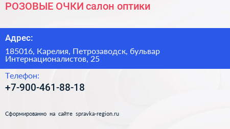 РОЗОВЫЕ ОЧКИ, салон оптики по адресу 185016, Карелия, Петрозаводск, бульвар Интернационалистов, 25 в дальнейшем Организация, размещена в следующих категориях: