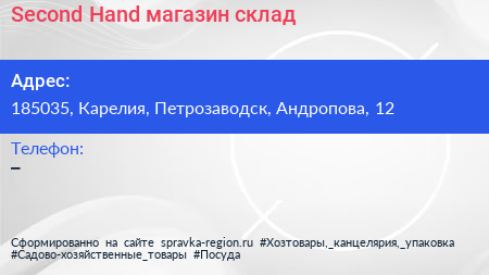 Second Hand, магазин-склад по адресу 185035, Карелия, Петрозаводск, Андропова, 12 в дальнейшем Организация, размещена в следующих категориях: