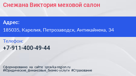 Снежана & Виктория, меховой салон по адресу 185035, Карелия, Петрозаводск, Антикайнена, 34 в дальнейшем Организация, размещена в следующих категориях: