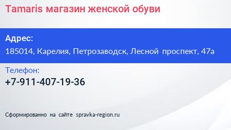 Tamaris, магазин женской обуви по адресу 185014, Карелия, Петрозаводск, Лесной проспект, 47а в дальнейшем Организация, размещена в следующих категориях: