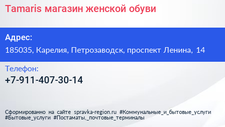 Tamaris, магазин женской обуви по адресу 185035, Карелия, Петрозаводск, проспект Ленина, 14 в дальнейшем Организация, размещена в следующих категориях: