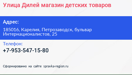 Улица Дилей, магазин детских товаров по адресу 185016, Карелия, Петрозаводск, бульвар Интернационалистов, 25 в дальнейшем Организация, размещена в следующих категориях: