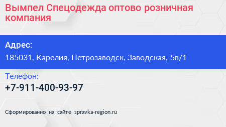 Вымпел Спецодежда, оптово-розничная компания по адресу 185031, Карелия, Петрозаводск, Заводская, 5в/1 в дальнейшем Организация, размещена в следующих категориях: