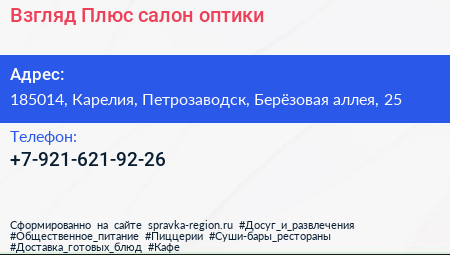 Взгляд-Плюс, салон оптики по адресу 185014, Карелия, Петрозаводск, Берёзовая аллея, 25 в дальнейшем Организация, размещена в следующих категориях: