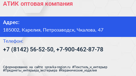 АТИК, оптовая компания по адресу 185002, Карелия, Петрозаводск, Чкалова, 47 в дальнейшем Организация, размещена в следующих категориях: