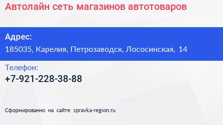 Автолайн, сеть магазинов автотоваров по адресу 185035, Карелия, Петрозаводск, Лососинская, 14 в дальнейшем Организация, размещена в следующих категориях: