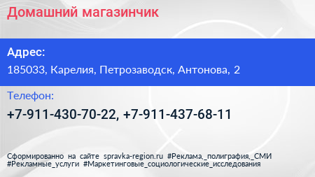 Домашний магазинчик по адресу 185033, Карелия, Петрозаводск, Антонова, 2 в дальнейшем Организация, размещена в следующих категориях: