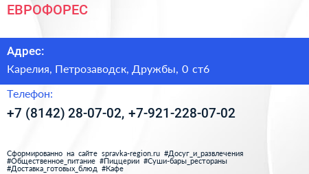 ЕВРОФОРЕС по адресу Карелия, Петрозаводск, Дружбы, 0 ст6 в дальнейшем Организация, размещена в следующих категориях:
