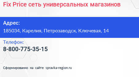 Fix Price, сеть универсальных магазинов по адресу 185034, Карелия, Петрозаводск, Ключевая, 14 в дальнейшем Организация, размещена в следующих категориях: