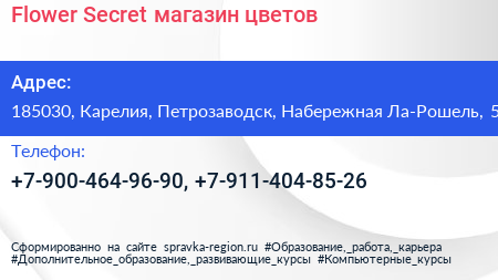 Flower Secret, магазин цветов по адресу 185030, Карелия, Петрозаводск, Набережная Ла-Рошель, 5 в дальнейшем Организация, размещена в следующих категориях: