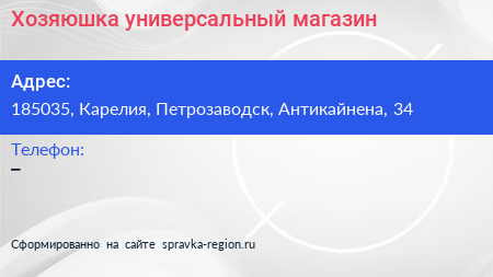 Хозяюшка, универсальный магазин по адресу 185035, Карелия, Петрозаводск, Антикайнена, 34 в дальнейшем Организация, размещена в следующих категориях: