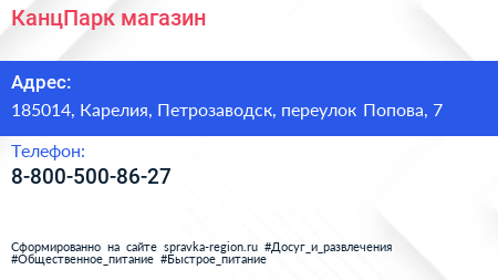 КанцПарк, магазин по адресу 185014, Карелия, Петрозаводск, переулок Попова, 7 в дальнейшем Организация, размещена в следующих категориях: