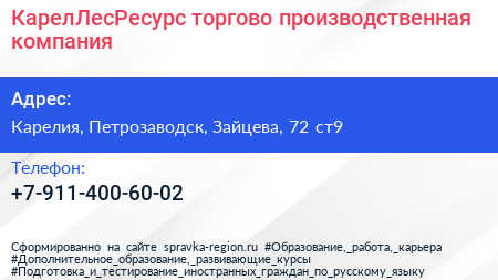 КарелЛесРесурс, торгово-производственная компания по адресу Карелия, Петрозаводск, Зайцева, 72 ст9 в дальнейшем Организация, размещена в следующих категориях: