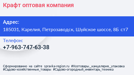 Крафт, оптовая компания по адресу 185031, Карелия, Петрозаводск, Шуйское шоссе, 8Б ст7 в дальнейшем Организация, размещена в следующих категориях: