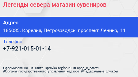 Легенды севера, магазин сувениров по адресу 185035, Карелия, Петрозаводск, проспект Ленина, 11 в дальнейшем Организация, размещена в следующих категориях: