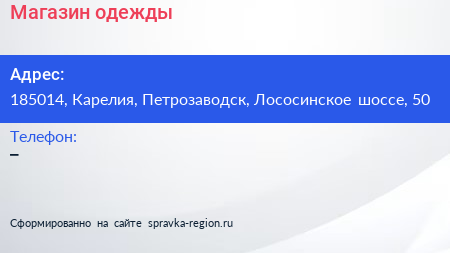 Магазин одежды по адресу 185014, Карелия, Петрозаводск, Лососинское шоссе, 50 в дальнейшем Организация, размещена в следующих категориях: