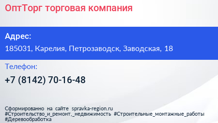 ОптТорг, торговая компания по адресу 185031, Карелия, Петрозаводск, Заводская, 18 в дальнейшем Организация, размещена в следующих категориях: