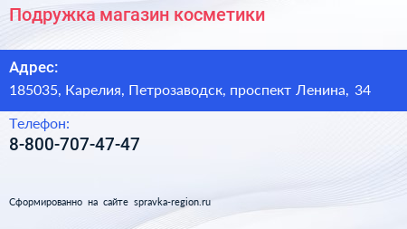 Подружка, магазин косметики по адресу 185035, Карелия, Петрозаводск, проспект Ленина, 34 в дальнейшем Организация, размещена в следующих категориях: