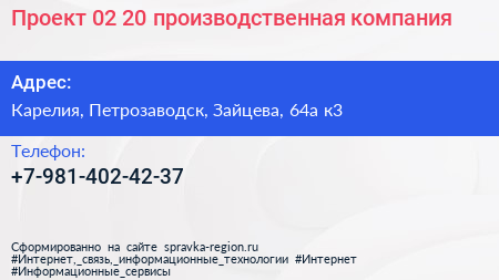 Проект 02.20, производственная компания по адресу Карелия, Петрозаводск, Зайцева, 64а к3 в дальнейшем Организация, размещена в следующих категориях: