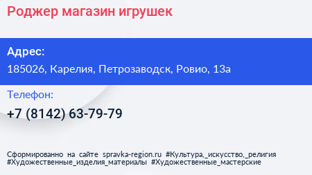 Роджер, магазин игрушек по адресу 185026, Карелия, Петрозаводск, Ровио, 13а в дальнейшем Организация, размещена в следующих категориях: