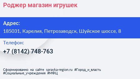 Роджер, магазин игрушек по адресу 185031, Карелия, Петрозаводск, Шуйское шоссе, 8 в дальнейшем Организация, размещена в следующих категориях: