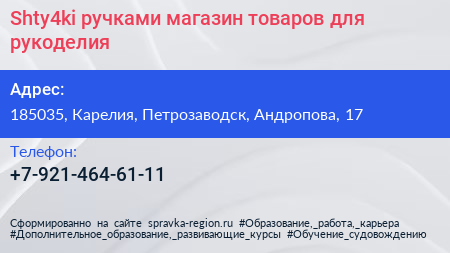 Shty4ki ручками, магазин товаров для рукоделия по адресу 185035, Карелия, Петрозаводск, Андропова, 17 в дальнейшем Организация, размещена в следующих категориях: