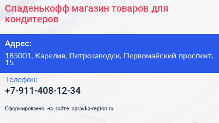 Сладенькофф, магазин товаров для кондитеров по адресу 185001, Карелия, Петрозаводск, Первомайский проспект, 15 в дальнейшем Организация, размещена в следующих категориях:
