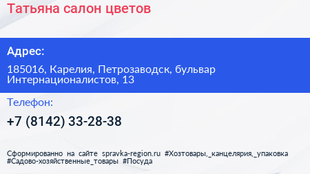 Татьяна, салон цветов по адресу 185016, Карелия, Петрозаводск, бульвар Интернационалистов, 13 в дальнейшем Организация, размещена в следующих категориях: