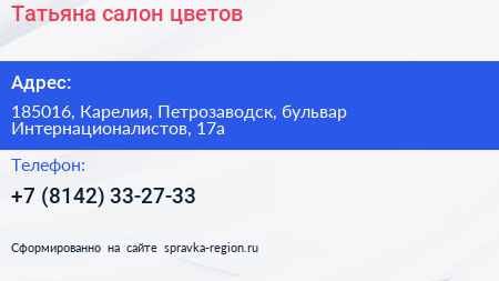 Татьяна, салон цветов по адресу 185016, Карелия, Петрозаводск, бульвар Интернационалистов, 17а в дальнейшем Организация, размещена в следующих категориях: