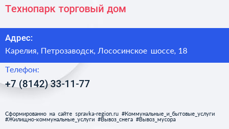 Технопарк, торговый дом по адресу Карелия, Петрозаводск, Лососинское шоссе, 18 в дальнейшем Организация, размещена в следующих категориях: