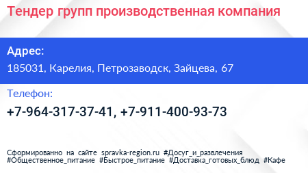 Тендер групп, производственная компания по адресу 185031, Карелия, Петрозаводск, Зайцева, 67 в дальнейшем Организация, размещена в следующих категориях: