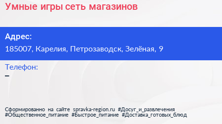 Умные игры, сеть магазинов по адресу 185007, Карелия, Петрозаводск, Зелёная, 9 в дальнейшем Организация, размещена в следующих категориях: