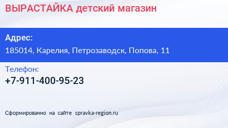 ВЫРАСТАЙКА, детский магазин по адресу 185014, Карелия, Петрозаводск, Попова, 11 в дальнейшем Организация, размещена в следующих категориях: