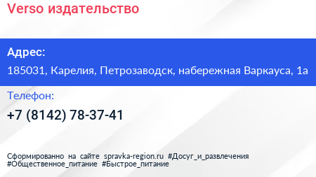 Verso, издательство по адресу 185031, Карелия, Петрозаводск, набережная Варкауса, 1а в дальнейшем Организация, размещена в следующих категориях: