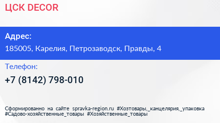 ЦСК DECOR по адресу 185005, Карелия, Петрозаводск, Правды, 4 в дальнейшем Организация, размещена в следующих категориях: