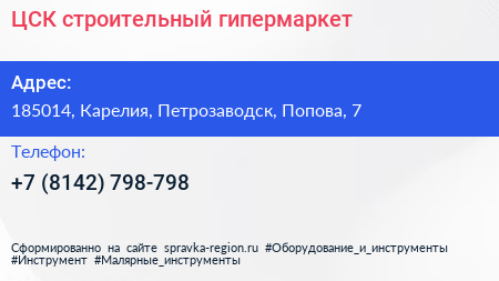 ЦСК, строительный гипермаркет по адресу 185014, Карелия, Петрозаводск, Попова, 7 в дальнейшем Организация, размещена в следующих категориях: