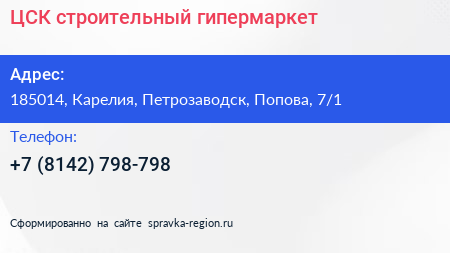 ЦСК, строительный гипермаркет по адресу 185014, Карелия, Петрозаводск, Попова, 7/1 в дальнейшем Организация, размещена в следующих категориях: