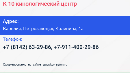 К-10, кинологический центр по адресу Карелия, Петрозаводск, Калинина, 1а в дальнейшем Организация, размещена в следующих категориях: