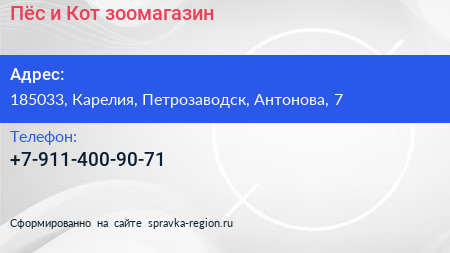 Пёс и Кот, зоомагазин по адресу 185033, Карелия, Петрозаводск, Антонова, 7 в дальнейшем Организация, размещена в следующих категориях: