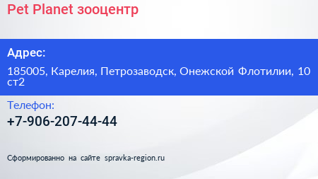 Pet Planet, зооцентр по адресу 185005, Карелия, Петрозаводск, Онежской Флотилии, 10 ст2 в дальнейшем Организация, размещена в следующих категориях: