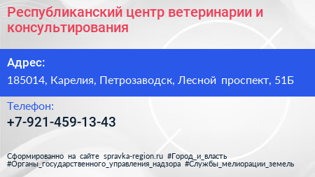 Республиканский центр ветеринарии и консультирования по адресу 185014, Карелия, Петрозаводск, Лесной проспект, 51Б в дальнейшем Организация, размещена в следующих категориях: