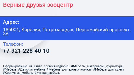 Верные друзья, зооцентр по адресу 185001, Карелия, Петрозаводск, Первомайский проспект, 36 в дальнейшем Организация, размещена в следующих категориях:
